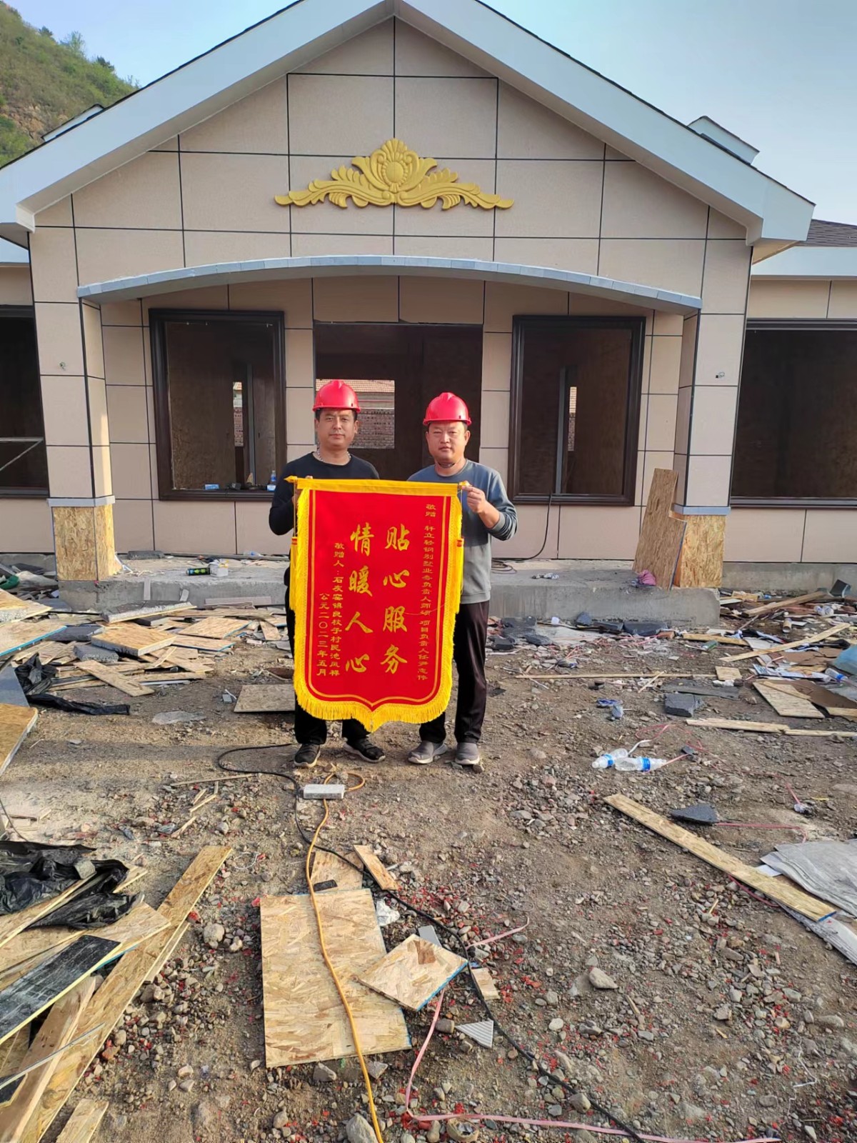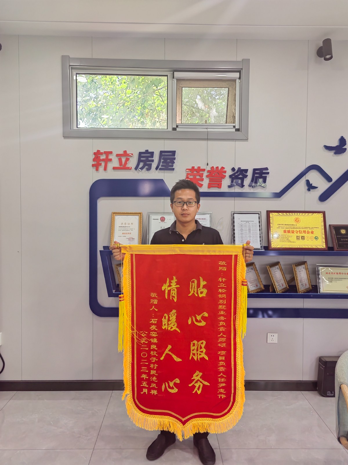 5月23號軒立業(yè)務經(jīng)理師碩及項目經(jīng)理尹志偉收到了來自承德市承德縣石灰窯鎮(zhèn)良杖子村業(yè)主池風祥先生送來的致謝錦旗,業(yè)主家為一層117.1平方米的四室兩廳一衛(wèi)輕鋼別墅,目前主體已經(jīng)完工,窗戶及入戶門還未安裝,雖未見完工后的效果,業(yè)主池先生就已經(jīng)把錦旗送到項目部,由項目經(jīng)理將錦旗送回公司,池先生對項目經(jīng)理尹志偉的專業(yè)及業(yè)務經(jīng)理師碩的負責進行了高度的贊揚。