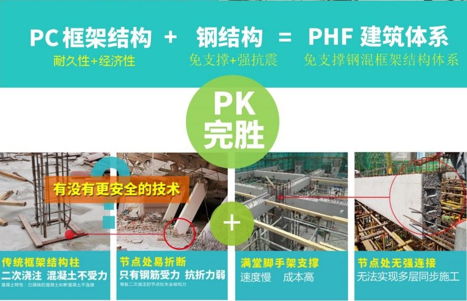 PHF建筑體系將 PC 構(gòu)件與鋼結(jié)構(gòu)連接方式有機(jī)結(jié)合、混合應(yīng)用,綜合了傳統(tǒng) PC 結(jié)構(gòu)和鋼結(jié)構(gòu)的優(yōu)勢,揚(yáng)長避短,施工更高效、效益更顯著。為行業(yè)開辟了一條新的賽道。